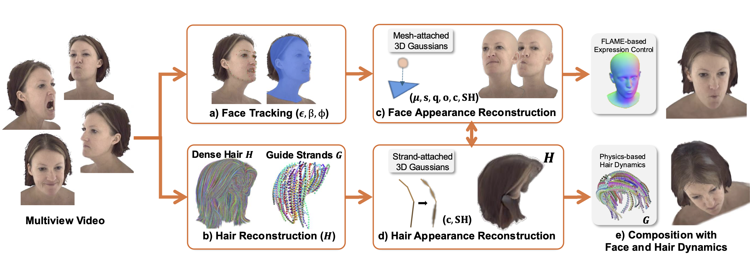 PhysHead reconstructs an animatable 3D human head avatar (e) from a multiview input video. It is based on a 3D Gaussian appearance representation that is split into a face (c) and a hair region (d). The face region uses 3D Gaussians that are attached to a 3DMM-based mesh, which allows for parametric facial expression as well as head pose control (a,c). To enable physics-based animation of the hair region, we rely on a strand-based hair model (b). The appearance of the individual hair strands is represented as structured 3D Gaussians attached to each hair strand segment (d).